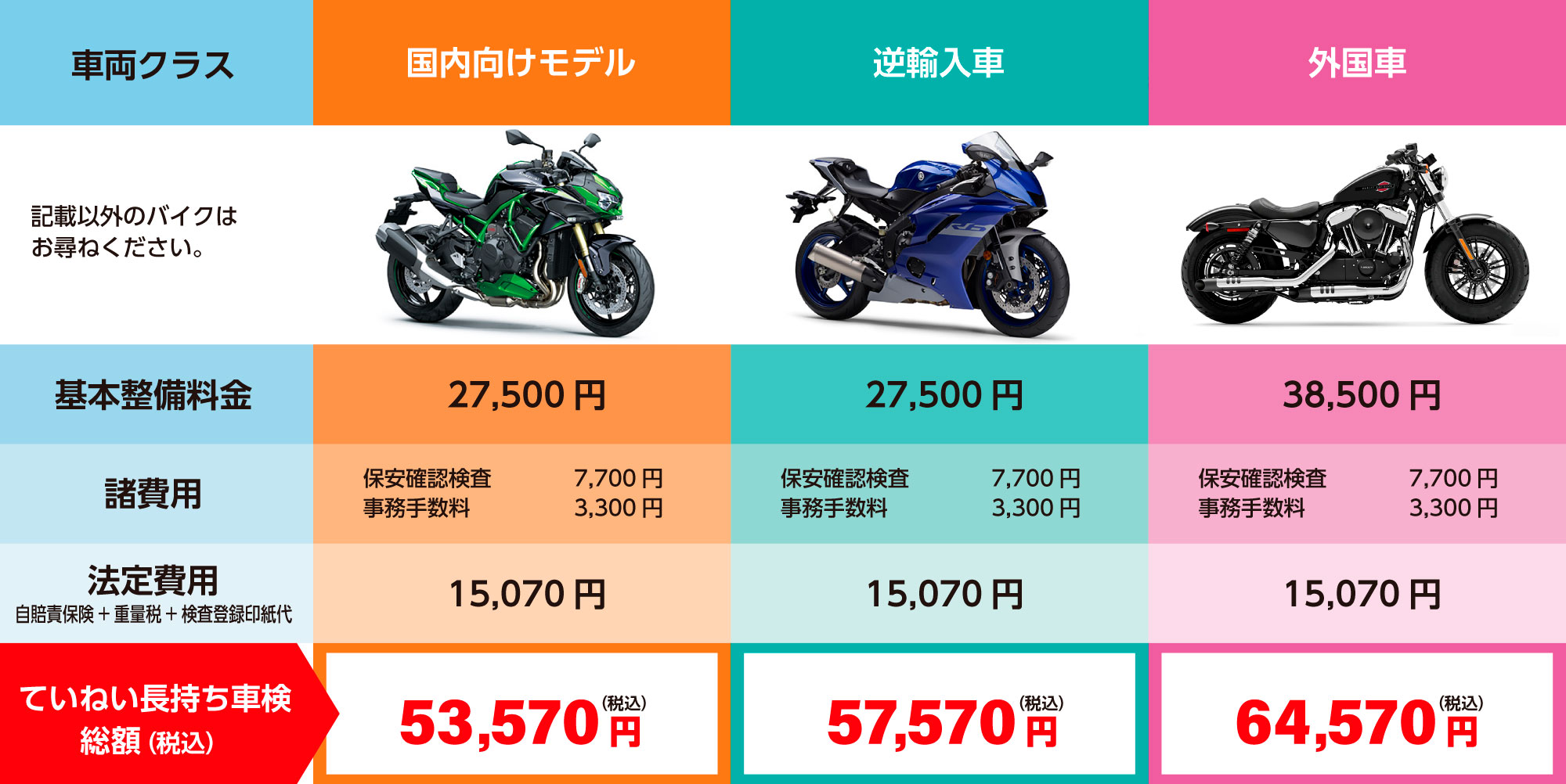 ていねい長持ち車検 料金表 【バイク・二輪車】